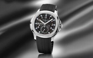 New Patek Philippe Aquanaut Travel Time luxury sports watch, 40,8mm, Stainless Steel , Ref. 5164A-001. They are reliable and practical, modern and somewhat unexpected, inspired by Nautilus. Their Stainless Steel case features a rounded, cushion-shaped octagon that is unmistakable. It has polished crown guards protruding from the right side of the watchcase to protect her. The beautiful embossed Black dial is one tone lighter than the strap, which has the same geosphere pattern. This color combination of dial and strap is the main attraction of this model. Perfectly readable large applied polished Arabic numerals made of 18k White Gold with luminescent coating in the form of hour markers look harmoniously. On the outer rim of the dial, a silver second track is printed with fairly wide luminous marks located every 5 minutes. The local time is indicated by large polished luminous 18k White Gold hour and minute hands, as well as a thin and elegant second’s hand (Sweep seconds hand). In addition, this model has an additional skeleton hand, which indicates the time of the second time zone. She can be controlled using rectangular Stainless Steel buttons on the case. The first, which is at 8 o’clock moves the second time zone hand forward in one-hour increments, while its twin at 10 o’clock moves the same hand back. There are small day/night apertures at 9 and 3 o’clock positions for both time zones, and a subdial date counter is visible at 6 o’clock. A polished Stainless Steel screw-down crown with a ribbed edge for a comfortable grip and the Patek Philippe logo is the finishing touch to the perfect picture. The dial is covered with a scratch-resistant sapphire crystal. The case back is also made of sapphire crystal, which allows you to see the magical work of the movement. Against this backdrop, a flat, fixed bezel in Stainless Steel , vertically ground on the front and polished on the sides, provides a wide view of the dial. The finish on the side of the bezel is amazing because at first glance, it looks rounded, but upon closer inspection, you can see the crisp edges playing with the light. The model is equipped with a Patek Philippe caliber 26‑330 S C FUS with a self-winding mechanical movement containing 29 jewels and a power reserve of min. 35 hours – max. 45 hours. This beautiful sport chic watch is presented on a Black tropical rubber strap, a new composite material that is ultra-resistant to wear, salt water and UV radiation. It fastens with Patek Philippe’s patented Stainless Steel folding clasp, polished and engraved with the Calatrava cross. Opening the clasp reveals the engraved Patek Philippe logo with the word GENEVE. Water resistant up to 120 m/394ft (12 ATM).