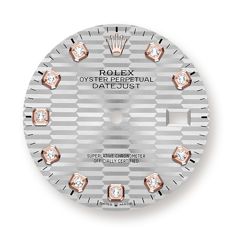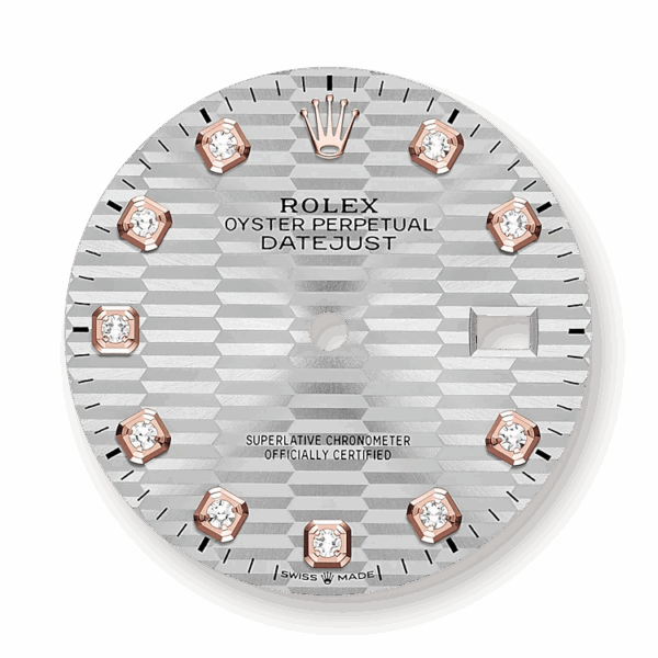 - Dial color: Silver dial with fluted motif and 10 Diamonds as hour markers framed in 18k Everose Gold