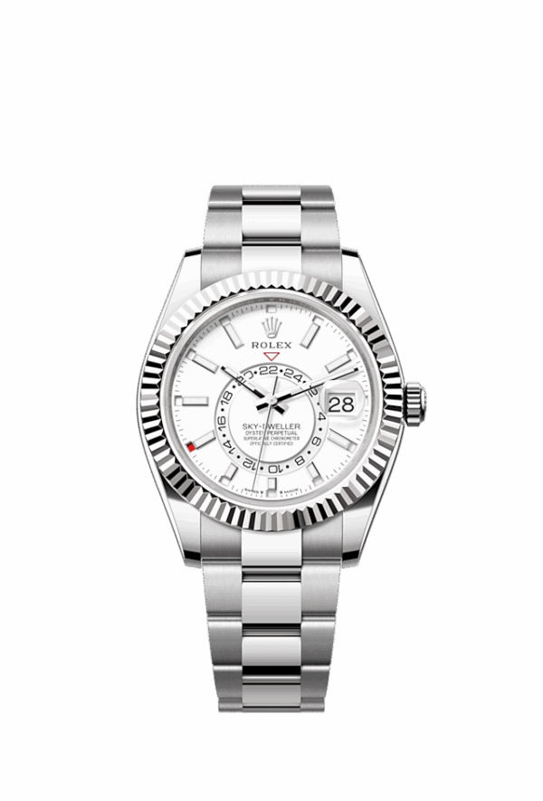 Unworn watch Rolex Sky-Dweller, 42mm, Oystersteel and 18k White Gold, Ref# 336934-0003. New for 2023, a true masterpiece of engineering. Elegant and versatile, this stunning timepiece is the perfect luxury accessory for the modern traveler. This superb chronometer features an Intense white dial, which is the perfect backdrop for the luminous 18k White Gold index hour markers and hands, making it easy to read the time even in low light conditions. A well-readable minute scale is applied along the outer contour of the dial. The sophisticated multi-function display makes it easy to keep track of the time in two different time zones. The reference time is displayed in 24-hour format on an off-center dial, while the local time is read using the normal central hands. The annual calendar, named Saros, is powered by a patented mechanism and features an innovative display: the months of the year are shown in 12 windows around the circumference of the dial, behind the hour marker – the current month is displayed in red. The instantaneous date change is related to local time. The ribbed, easy-to-grip Triplock Oystersteel screw-down crown features a triple water-resistance system in and Rolex logo decorated. The dial is covered with a scratch-resistant sapphire crystal with anti-reflective coating and Cyclops lens at the 3 o’clock position. The fluted bezel in 18k White Gold is a true hallmark of Rolex. Bidirectional rotatable, it is part of the Ring Command system and, when interacting with the crown, allows the user to select watch functions one by one and adjust them easily, quickly and simply. The model is powered by the innovative in-house Rolex mechanical movement, caliber 9002, contains 29 jewels and has an approximate power reserve of approximately 72 hours. This delightful timepiece is presented on an Oyster bracelet with one-piece three-piece links in Oystersteel. Thanks to the new hidden fastening system under the bezel, there is a perfect visual continuity between the bracelet and the case. The bracelet features an Oysterclasp folding clasp with Rolex’s original Easylink patented quick extension system of approximately 5mm for added comfort in all circumstances. Water resistant up to 100m/330ft (10 ATM).